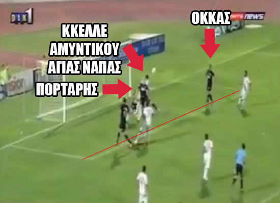 «Πέναλτι για την Αγία Νάπα δε δίνεται και στα τελευταία λεπτά του αγώνα σκοράρει ο Οκκάς από πεντακάθαρη θέση οφσάιντ. Σωτηρίου/Γεωργίου»