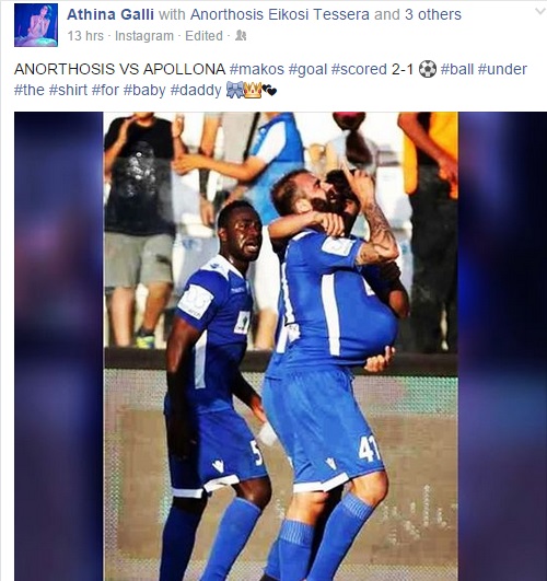 Δευτερόλεπτα μετά την επίτευξη του γκολ από το Γρηγόρη Μάκο, μια μπάλα… «φύτρωσε» στα χέρια του Αδάμου Ανδρέου και από εκεί στα χέρια του σκόρερ, ο οποίος θέλησε να χαρίσει το 2-1 στο παιδί που θα έρθει σύντομα στη ζωή. Η σύζυγος του Ελλαδίτη μέσου έκανε τη δική της παρέμβαση στο facebook και την οποίαν σας παραθέτουμε:
