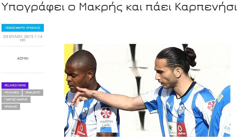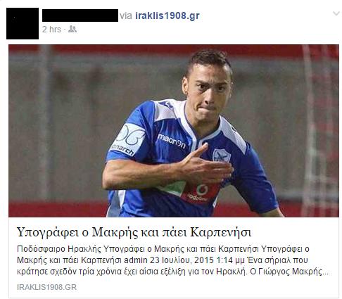 Συγκεκριμένα οι Θεσαλλονικείς απέκτησαν τον Γιώργο Μακρή που αγωνίστηκε στην Ανόρθωση τη διετία 2012-2013, μετρώντας 13 συμμετοχές. Η φωτογραφία δε στην ιστοσελίδα των φίλων του Ηρακλή αποκαταστάθηκε στην συνέχεια.
