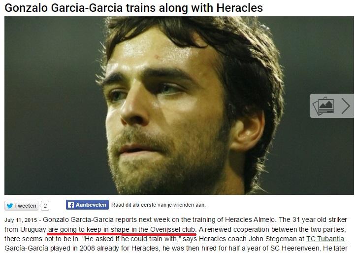 Στις προπονήσεις της Χεράκλες θα συμμετάσχει το επόμενο χρονικό διάστημα ο Γκονζάλο Γκαρσία, ούτως ώστε να κρατηθεί σε φόρμα, όπως αναφέρει Ολλανδικό δημοσίευμα. Στο εν λόγω άρθρο διευκρινίζεται ότι δε τίθεται θέμα συνεργασίας των δύο πλευρών, αλλά το ότι ο Ουρουγουανός ζήτησε από τον τεχνικό της Ολλανδικής ομάδας να λάβει μέρος στις προπονήσεις.