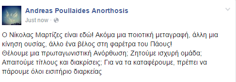 Με μήνυμα στον προσωπικό λογαριασμό που διαθέτει στο facebook, ο γιος τους προέδρου, Αντρέας Πουλλαϊδης, δεν έκρυψε την ικανοποίηση του για το αίσιο τέλος που είχε η περίπτωση Μαρτίνες στην ομάδα μας καλώντας μάλιστα τους φίλους της Ανόρθωσης όπως αποκτήσουν εισιτήριο διαρκείας, στηρίζοντας με αυτό τον τρόπο την προσπάθεια που γίνεται.