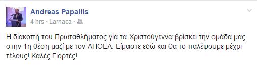 Δε θα μπορούσε να ζητήσει καλύτερα Χριστούγεννα ο Ανδρέας Παπαλλής και οι συνεργάτες του μιας και η τελευταία αγωνιστική του 2015, φέρνει τη φουτσαλική Ανόρθωση στην κορυφή. Με 26 βαθμούς σε 10 αγώνες, η «Μεγάλη Κυρία» έπιασε τον ΑΠΟΕΛ στην κορυφή όντας αήττητη, με τον πρόεδρο του τμήματος να ανεβάζει την πιο κάτω ανάρτηση στο facebook: