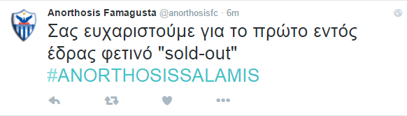 Να και το sold out! ΣΦΗΝΑΚΙΑ Δημοσιεύτηκε στις: 20/12/2015 - 17:46 Με ανάρτησή της στο Twitter, η επίσημη Ανόρθωση ανακοίνωσε το sold out στο σημερινό αγώνα. Τα τελευταία εισιτήρια που διατέθηκαν στα εκδοτήρια εξαντλήθηκαν με αποτέλεσμα το «Αντώνης Παπαδόπουλος» να σφύζει από ζωή.1911 Supporters Previous articleΑνόρθωσις-Νέα Σαλαμίνα (Ζωντανά)Next articleΚαθαρό το πέναλτι! Προκλητικοί οι Σαλαμιναίοι! ΡΟΗ ΕΙΔΗΣΕΩΝ Αγωνία για Αρτυματά 09/11/2025 Δύσκολη έδρα… 09/11/2025 Έτσι διαμορφώθηκε η βαθμολογία 09/11/2025 «Ο προπονητής μας θέλει να πηγαίνουμε…» 09/11/2025 «Ήταν εμφάνιση που θύμισε πως πρέπει να είναι η Ανόρθωση…» 09/11/2025 ΒΙΝΤΕΟ: Τα στιγμιότυπα κόντρα στην Πάφο 09/11/2025 ΡΟΗ ΕΙΔΗΣΕΩΝ