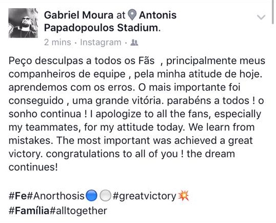 Με φωτογραφία και σχόλιο που ανέβασε στον προσωπικό του λογαριασμό στο Facebook, ο Γκάμπριελ απολογείται για την ενέργειά του που άφησε την Ανόρθωση με παίκτη λιγότερο.