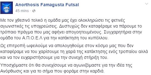 Τοποθέτηση στον επίσημο λογαριασμό του στο facebook έκανε το φουτσαλικό τμήμα της Ανόρθωσης, μετά και το χθεσινό ανεπιτυχές αποτέλεσμα στη Λευκωσία. Στα πλαίσια της αυτοκριτικής απευθύνει τις απολογίες του σε όλο τον Ανορθωσιάτικο κόσμο που δεν κατάφερε να του χαρίσει την πρώτη διάκριση της τελευταίας διετίας και παράλληλα αφήνει υποσχέσεις για ένα λαμπρότερο μέλλον.