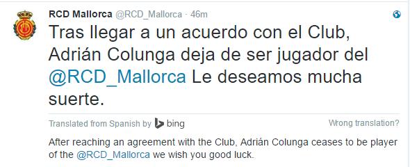 Σημαντική έως και καταλυτική εξέλιξη σημειώθηκε η οποία αφορά την κάθοδο του Κολούνγκα στην Κύπρο για λογαριασμό της Ανόρθωσης. Με ανάρτησή της στο twitter, η επίσημη Μαγιόρκα ανακοίνωσε τη λύση της συνεργασίας με τον Ισπανό ποδοσφαιριστή, που ήταν ουσιαστικά το τελευταίο εμπόδιο προκειμένου να προβάρει τη φανέλα με το φοίνικα στο στήθος.