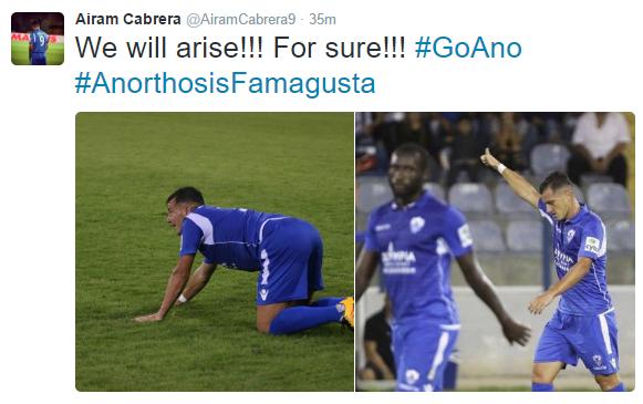 «Θα εξυψωθούμε» ΣΦΗΝΑΚΙΑ Δημοσιεύτηκε στις: 25/10/2016 - 15:41 Αποφασισμένος να μην παραδώσει τα όπλα και να παλέψει για την αγωνιστική ανάκαμψη είναι ο πρώτος φετινός σκόρερ της Ανόρθωσης. Ο Αϊράμ Καμπρέρα ανέβασε στον προσωπικό του λογαριασμό στο twitter το εξής:1911 Supporters Previous articleΌλα τα λεφτά και όλη η ουσία η ατάκα Βιολάρη!Next articleΓούσταρε τρελά ο Βάγκνερ! ΡΟΗ ΕΙΔΗΣΕΩΝ Αγωνία για Αρτυματά 09/11/2025 Δύσκολη έδρα… 09/11/2025 Έτσι διαμορφώθηκε η βαθμολογία 09/11/2025 «Ο προπονητής μας θέλει να πηγαίνουμε…» 09/11/2025 «Ήταν εμφάνιση που θύμισε πως πρέπει να είναι η Ανόρθωση…» 09/11/2025 ΒΙΝΤΕΟ: Τα στιγμιότυπα κόντρα στην Πάφο 09/11/2025 ΡΟΗ ΕΙΔΗΣΕΩΝ