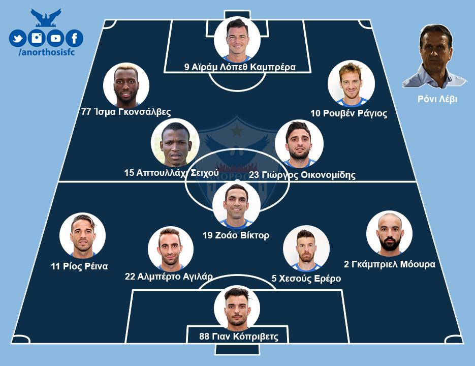 Και Σάντος και Καλδερόν εκτός αρχικής ενδεκάδας αφήνει ο Ρόνι Λέβι, στέλνοντας τα μηνύματα ότι ουδείς δεν έχει εξασφαλισμένη θέση βασικού. Μπροστά από τον Κόπριβετς θα παραταχθούν από αριστερά προς δεξιά οι Ρέινα, Ερέρο, Αγκιλάρ και Γκάμπριελ, ενώ στη μεσαία γραμμή οι Βίκτορ και Σιβού θα πλαισιωθούν από τον Οικονομίδη. Γκονσάλβες και Καμπρέρα διατηρούνται στο αρχικό σχήμα, με τον Ράγιος να παίρνει θέση στα άκρα της επίθεσης αντί του Καλό.