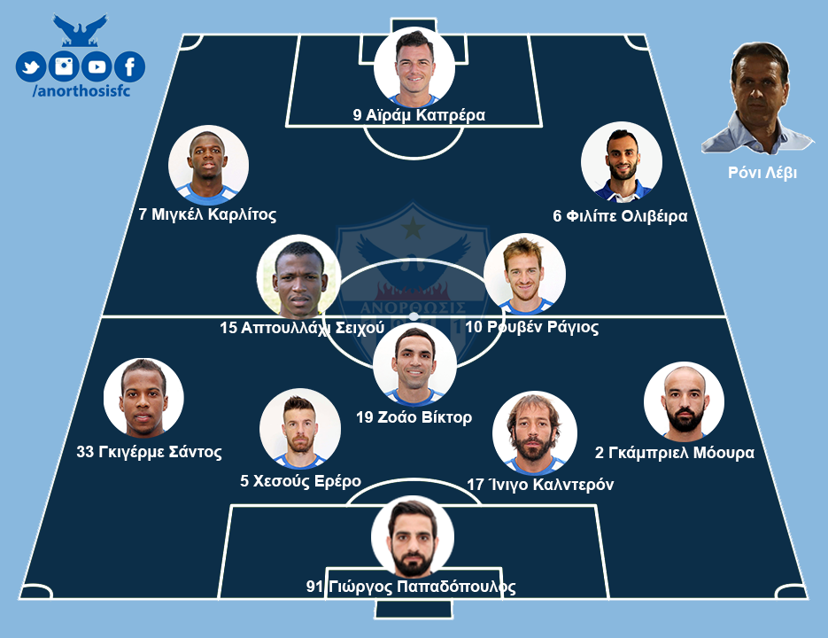 Από εκεί και πέρα ο Γιώργος Παπαδόπουλος πραγματοποιεί ντεμπούτο κάτω από τα δοκάρια στο αρχικό σχήμα αγώνα πρωταθλήματος, με τους Γκάμπριελ και Σάντος να καλύπτουν τα άκρα. Στη μεσαία γραμμή πλην του Σιβού θα βρεθούν οι Βίκτορ και Ράγιος, ενώ στη γραμμή κρούση θα βρεθούν οι Καλό και Ολιβέιρα να πλαισιώνουν τον Καμπρέρα.