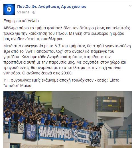 Ανακοίνωση με την οποίαν ενημερώνει για τη συνάντηση που θα γίνει στο χώρο στάθμευσης του «Αντώνης Παπαδόπουλος» εξέδωσε ο Παν.Συ.Φι. Ανόρθωσις Αμμοχώστου. Η φουτσαλική ομάδα θα ψάξει αύριο τη δεύτερη νίκη στη σειρά των τελικών που θα φέρει το τρόπαιο στη Λάρνακα και όλοι οι Ανορθωσιάτες καλούνται όπως συγκεντρωθούν για να παρακολουθήσουν τον αγώνα από γιγαντοοθόνη με συνοδεία φαγητού.