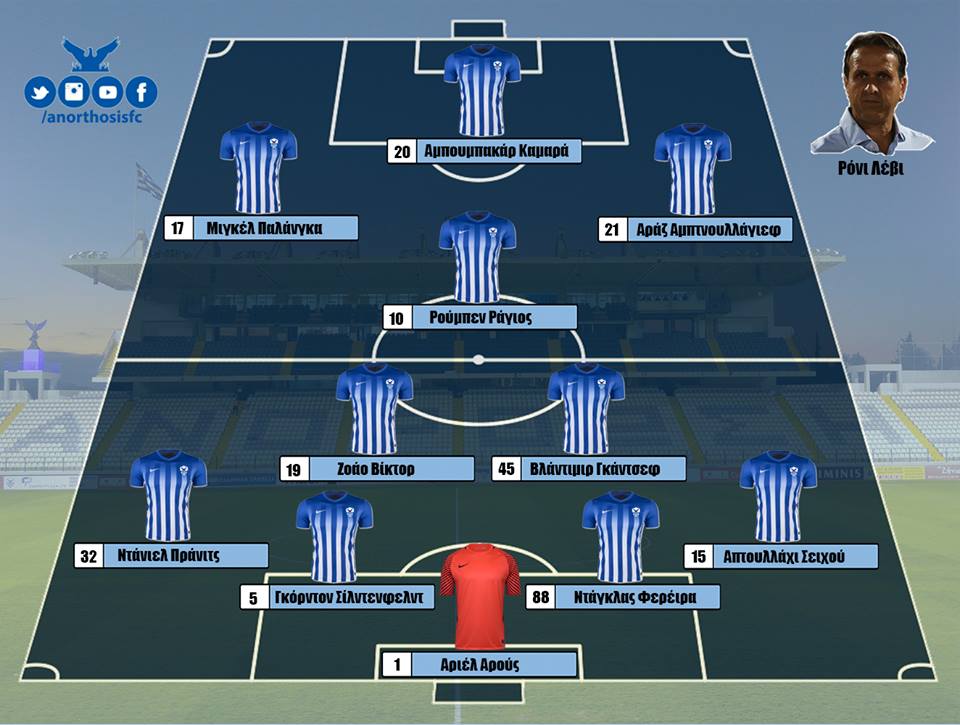 Δίχως αλλαγή στο αρχικό σχήμα σε σχέση με το παιχνίδι απέναντι στον Ερμή, παρατάσσει την ομάδα μας, ο Ρόνι Λέβι.