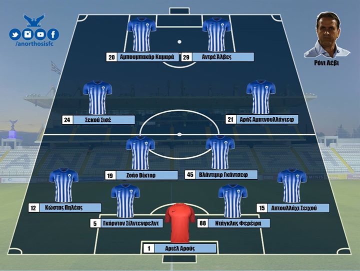 Χωρίς εκπλήξεις στο αρχικό σχήμα λόγω περιορισμένων επιλογών παρατάσσει την ομάδα μας ο Ρόνι Λέβι απέναντι στον Εθνικό Άχνας. Ο Αρούς θα υπερασπιστεί την εστία με τους Πηλέα, Σίλντενφελντ, Ντουγκλάο και Σιβού στην άμυνα από αριστερά προς δεξιά. Στη μεσαία γραμμή θα βρεθεί ο Βίκτορ με τον Γκάντσεφ, την ίδια ώρα που οι Σισέ και Αράζ επιλέχθηκαν ως ακραίοι επιθετικοί. Άλβες και Καμαρά θα συνθέσουν το επιθετικό δίδυμο σε σχηματισμό 4-4-2.