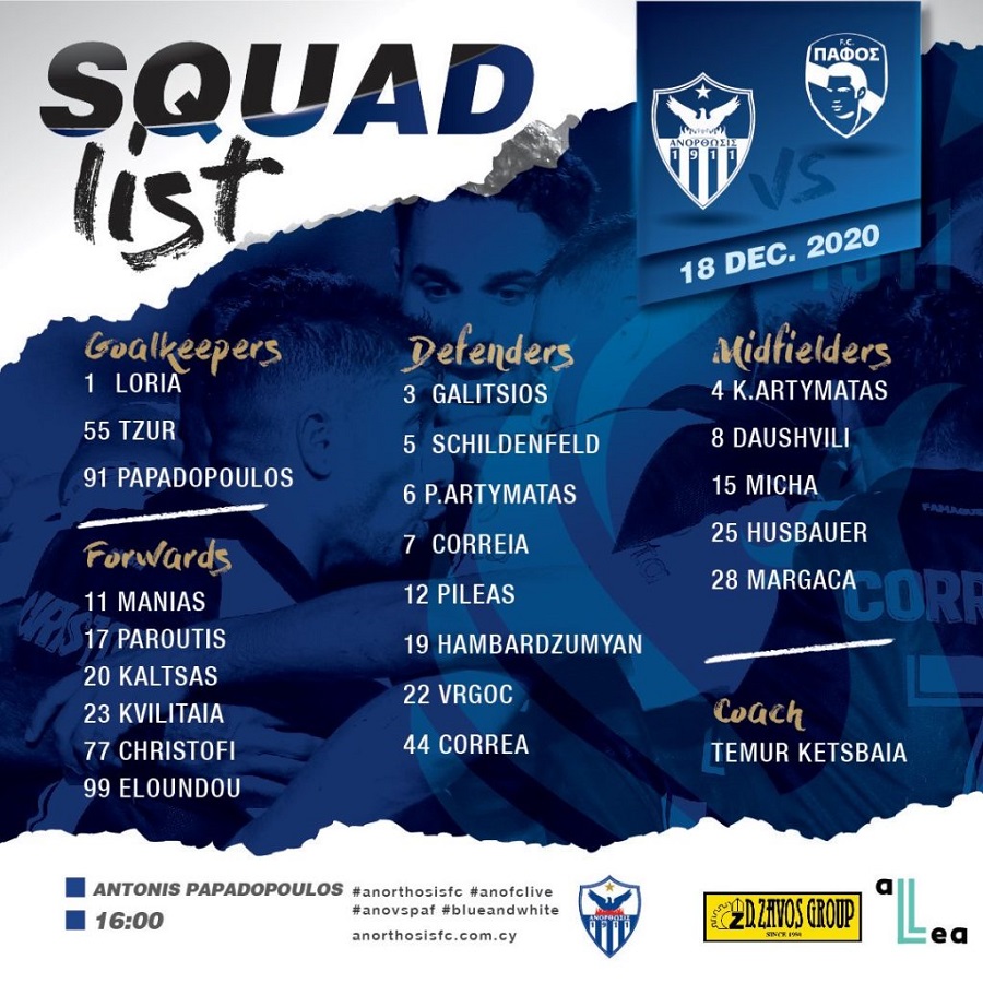Κόντρα στον Ερμή ο προπονητής δεν είχε στη διάθεσή του για διάφορους λόγους τους Ελουντού, Αμπαρτζουμιάν και Νταουσβίλι οι οποίοι θα βρεθούν στην 22μελή αποστολή εν όψει Πάφος FC.