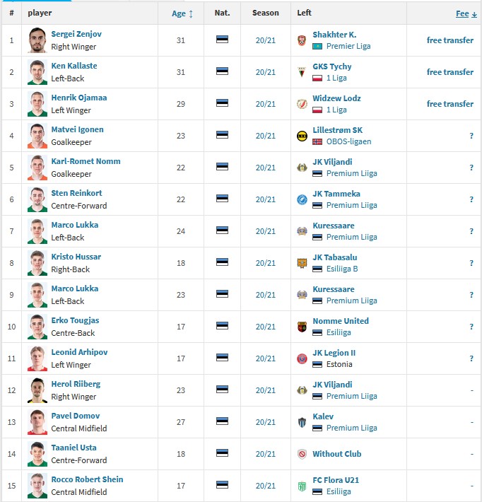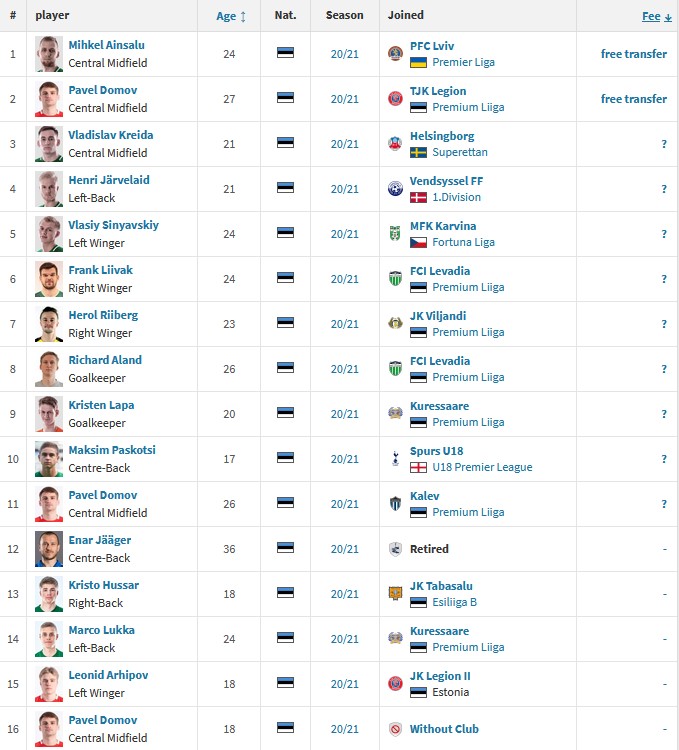 Η αγοραστική αξία του υφιστάμενου ρόστερ των Εσθονών ανέρχεται στα 4,5 εκατομμύρια ευρώ. Στη φετινή μεταγραφική περίοδο, έχουν αποχωρήσει από την ομάδα 16 ποδοσφαιριστές.