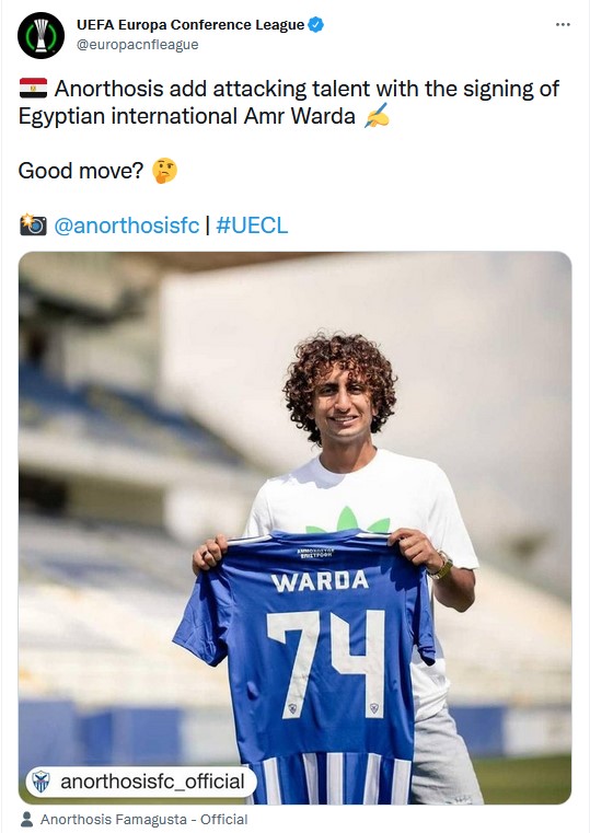 Την μεταγραφή του Ουάρντα στην ομάδα μας σχολίασε η UEFA μέσω του επίσημου λογαριασμού που διαθέτει για το Europa Conference League στα μέσα κοινωνικής δικτύωσης.
